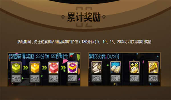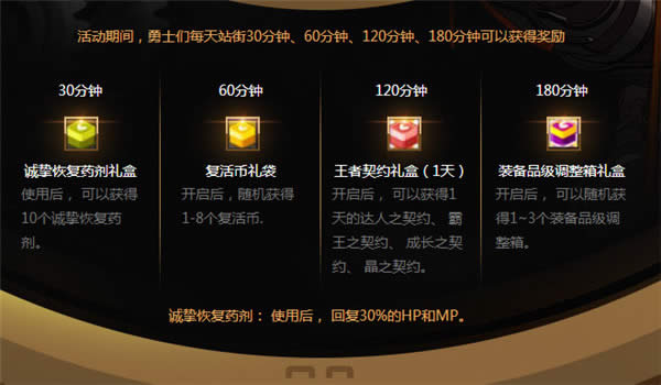 活动期间,勇士们每天站街30分钟、60分钟、120分钟、180分钟可以获得奖励