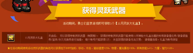 在活动期间使用活动灵跃武器的角色可以获得如下BUFF加成:移动、攻击、施放速度+15%,物理、魔法暴击+30%,所有技能Lv+1,力量、智力+100。
