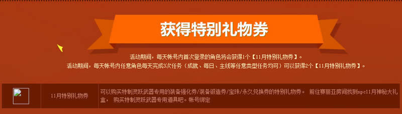 3玩家每天首次登录或者物品栏已满时将以邮件提供【11月特别礼物券】,保存期限为1天,请及时收取。