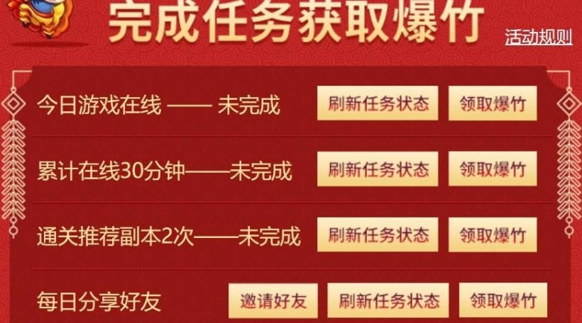 玩家在活动页面中完成指定的活动任务即可获得爆竹,玩家燃放爆竹时,可以获得1个积分,每天最多燃放5个爆竹,也就是每天最多获得5个积分。