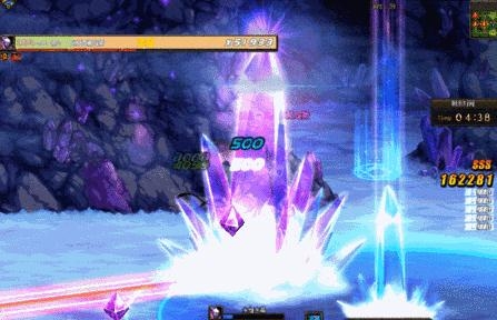 机制四:水晶的洗礼,阿莫西斯比斯会生成一面水晶墙,并落下红蓝水晶(和机制1一样效果),然后到另一边,释放大量紫水晶。玩家可以击打移动至红蓝水晶处的紫水晶,引起爆炸抵消水晶,也可找个位置进行卡位,不被吸附移动即可。