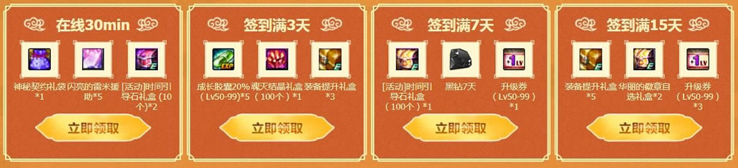 2.领取在线30min礼包后,签到天数增加1,签到累积一定天数后,可领取对应礼包,各礼包单Q限领1次