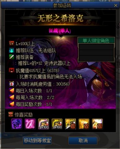 征战模式限制单人进入,入场消耗30点疲劳值,抗魔要求6157点,每天可入场一次,每周入场三次,与团队模式不共享入场次数,每周四刷新奖励。