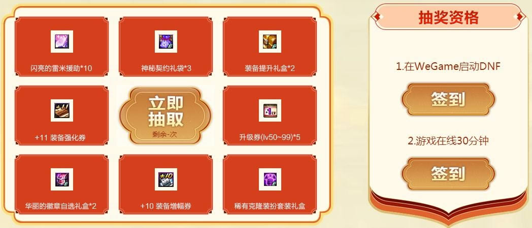 1、每日使用WeGame启动DNF后可在本页面领取一次抽奖机会,单Q每日限领一次;