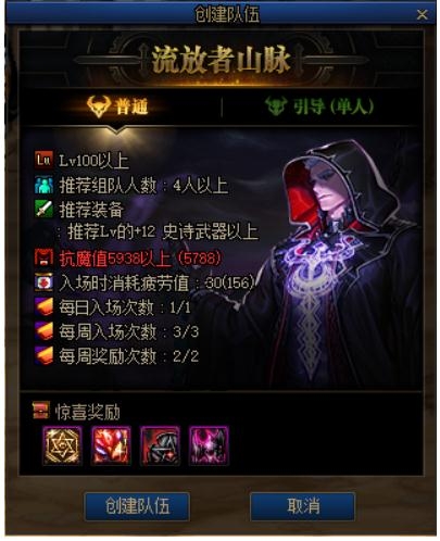 在流放者山脉的指定频道中,小伙伴们可以创建流放者山脉队伍。和其他特殊副本一样,流放者山脉队伍分为四人组队的常规队伍与方便单人玩家的引导模式,勇士们可以根据自身的情况进行选择。