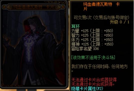 纯血者德瓦斯特卡片附魔的部位是耳环,其特点为四维+125,可晋级一次,晋级后的满特点为四维+150。就特点来看,是现在耳环附魔的尖端卡片,与魔界大战的BOSS黑眼之夏勒有相同的满特点。