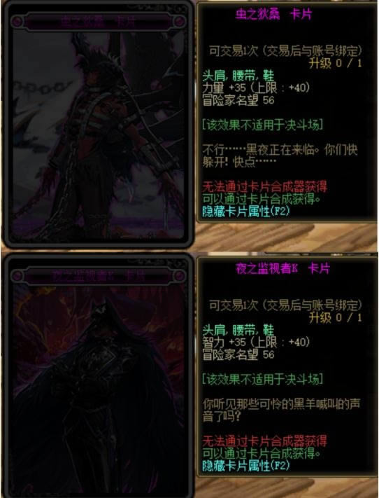 这两张卡片的特点分别为力气、智力添加35,满特点为40,可附魔的部位是头肩、腰带、鞋。无论是从特点仍是可附魔的部位来看,这两张卡片都是妥妥的坯子神器卡,没有太多可讲的当地。若是翻金牌翻到这两张卡片,那或许要白快乐一场了。