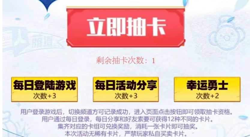 玩家首次进入活动页面即可获得1次抽卡机会,幸运勇士玩家首次进入活动页面时,额外获得2次抽卡机会。玩家每日登录游戏和分享活动均可获得3次抽卡机会。