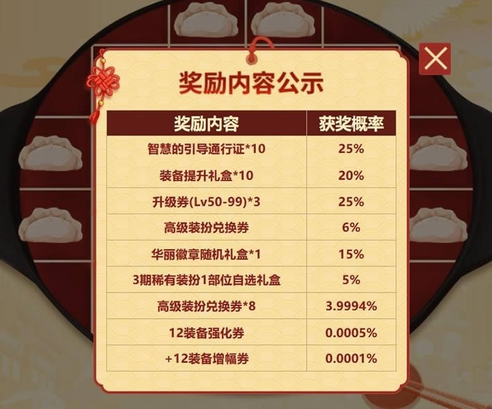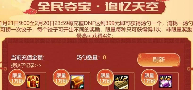 1月21日9:00至2月20日23:59每充值DNF达到399元即可获得汤勺一个,消耗一汤勺可捞一次饺子,每个饺子可开出不同的奖励,限量每种只可获得得1次,非限量奖励最高可获得4次。