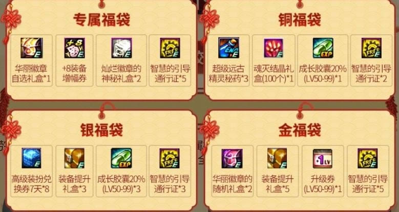 1月21日9:00至2月20日23:59充值DNF达到399元即可领取以下符合自身会员等级的奖励一份。特邀和心悦1的奖励都是1个50点疲劳药、5张智慧的引导通行证、3个装备提升礼盒和1个华丽的徽章自选礼盒。