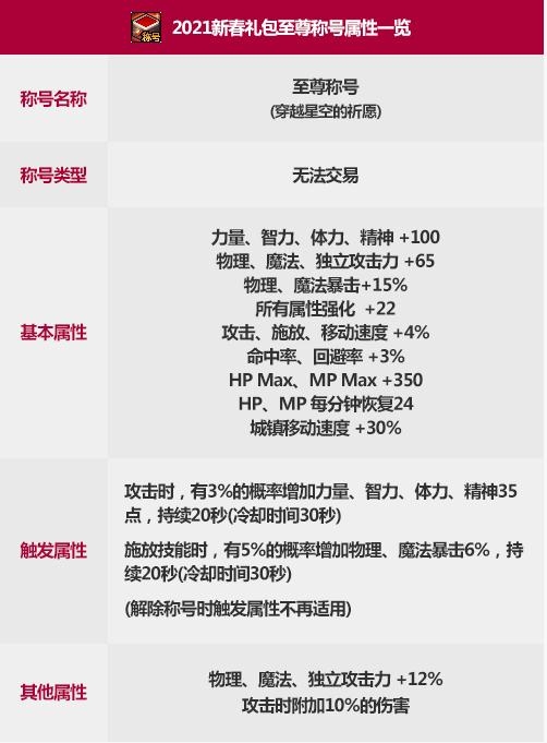春节也即将来临,按照每年的惯例,DNF将在春节到来之际推出春节套,现在DNF官方已经公布了今年春节礼包的内容。那么这个2021新春礼包穿越星空的祈愿至尊称号属性怎么样?下面就跟着本站小编一起来看看吧!