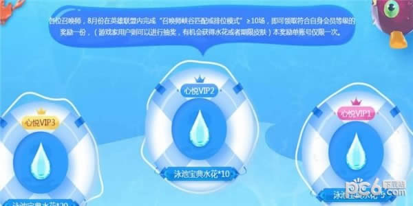 3.水花的作用:每收集10朵水花,即可提升1个宝典等级,宝典等级提升,解锁奖励,召唤师可以在其中获得275款奖励!详细奖励请查看英雄联盟“泳池派对宝典”