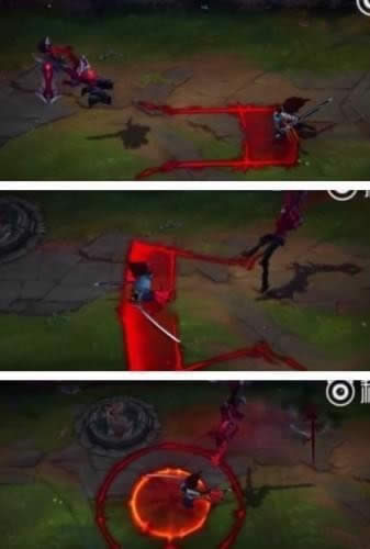 W技能剑魔猛击地面,对前方第一个命中的敌人造成伤害并短暂减速。如果被命中的是敌方英雄,那么会生出一条锁链,如果对方短期内没有逃脱这个范围,就会被拉回中心并造成二次伤害。我们可以看到图中的卡莎被W技能命中,剑魔又接了一个Q击飞,不让她逃离出去,随后卡莎被拉回中心,又吃了一顿毒打。