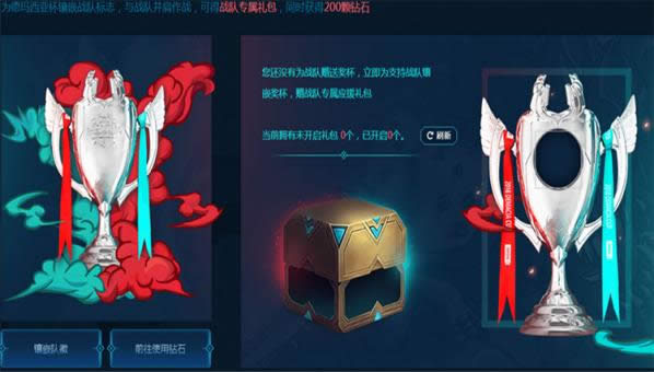 为德玛西亚杯镶嵌战队标志,与战队并肩作战,可得战队专属礼包,同时获得200颗钻石