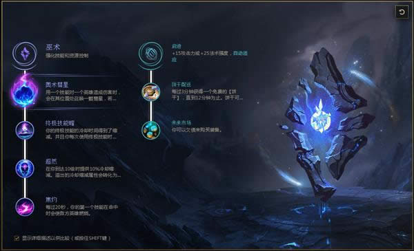 发条作为一名爆发非常高的中单AP,我们选择了巫术系的奥术彗星作为基石天赋,终极技能帽让R大招CD更短,超然进一步减少CD,焦灼让技能造成烧伤,副系选择启迪系的饼干,让发条对线期能够更好掌握清线权,未来市场加快装备成形。
