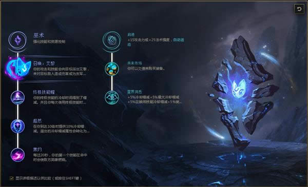 女枪的主要输出手段还是依靠R大招,因此我们选择了巫术系,艾黎能让Q的爆发更高,终极技能帽减少R冷却时间,超然再一步减少CD,焦灼让R技能带灼烧效果,副系选择未来市场让女枪更快成形,星界洞悉再减少CD,玩的就是满CD大招流。