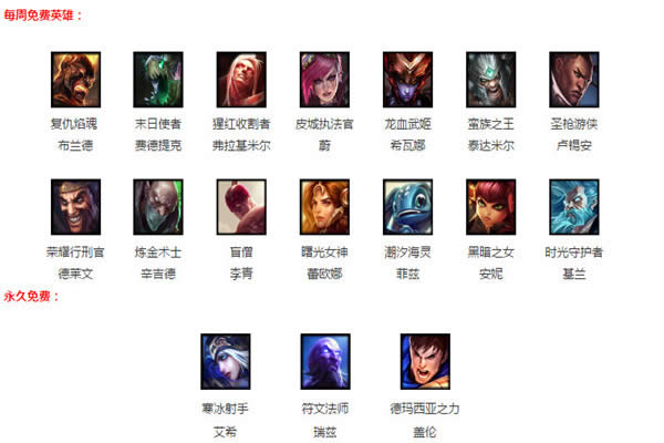 3.另外,在中国的服务器中,我们额外增加了三个永久免费的英雄——寒冰射手艾希、德玛西亚之力盖伦和符文法师瑞兹。这三个英雄是永久免费供所有玩家使用的。主要目的也是便于那些刚刚打完新手实战训练营的玩家能够至少有一个自己会用的英雄。