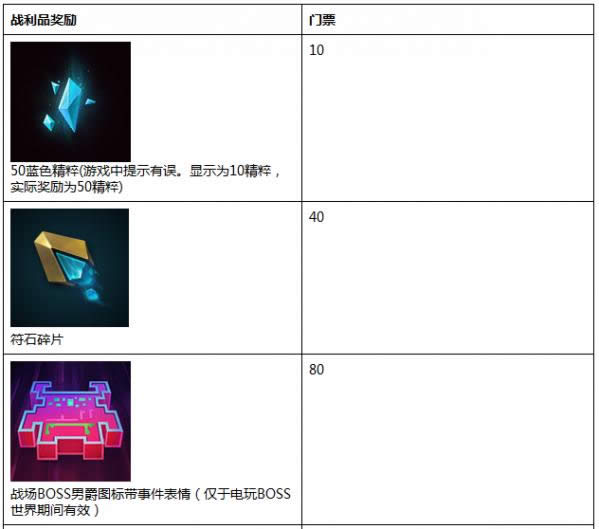 完成任务的奖励为门票和法球。作为电玩BOSS世界的一部分,活动期间购买常规海克斯科技战利品或其礼包将额外赠送门票。门票和代币类似:你可以将它们打造成战利品奖励。它们将于2017年9月15日00:00之后失效。
