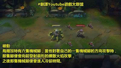 这是厄加特的被动,他的每只机械腿都是强大的杀器,当敌人处在机械腿的位置时,就会产生AOE攻击,攻击完后进行冷却,大家可看到,但是被动的攻击,就险将实验者喷死