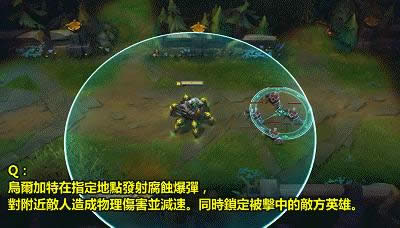 Q技能是主要伤害技能,在指定地点发射腐蚀爆弹,造成伤害并有减速效果,还会锁定敌方英雄