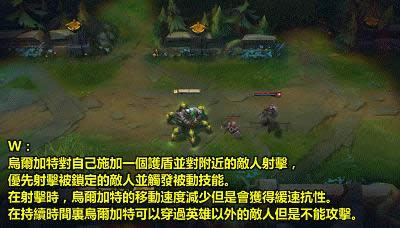 W技能,加护盾并持续向周围敌人射击,和Q技能互动,优先射击被锁定的敌人,这个火力看起来是相当猛的,有减速抗性,配合Q技能可不断风筝敌人