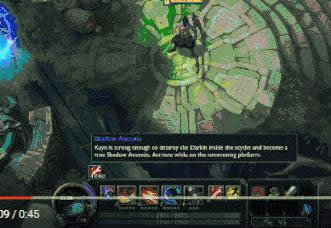 当你用凯隐在击杀小兵和敌人时会吸收灵魂,但灵魂数量满了之后可以手动选择变身(如上图),届时你的头像会一分为二,你可以根据当前的局势选择暗影刺客或暗影化身。