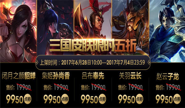 即日起以下三国系列皮肤限时折扣(6月28日 10:00-7月4日 23:59):