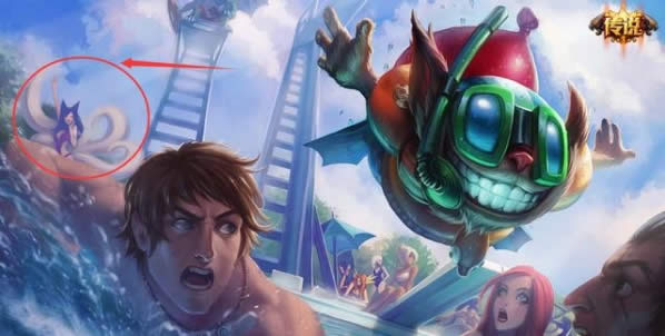 除了玩家们的自制之外,其实阿狸早在泳池派对原画中就有出现了,下面是泳池派对吉格斯的原画,阿狸就在其中。