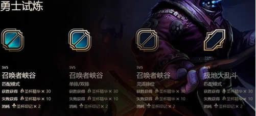 每个难度的试炼,支持召唤师峡谷匹配、极地大乱斗、召唤师峡谷单排/双排以及召唤师峡谷灵活排位4种模式,每个模式可获得的奖励各不相同。