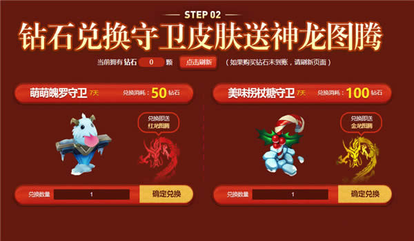 1.钻石可以兑换珍稀守卫皮肤,同时获赠神龙图腾。