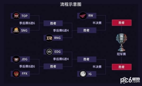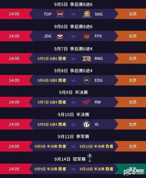 常规赛排名各自半区3、4名的四支队伍,将会在9月5日和9月6日开启第一轮的季后赛争夺,届时TOP将对阵SNG,JDG则是面对夏季赛后半程状态回归的FPX。两组对阵的胜者将进入第二轮6进4的赛事。前者的胜者将对阵RNG,后者的胜者将要面对的是豪门EDG。
