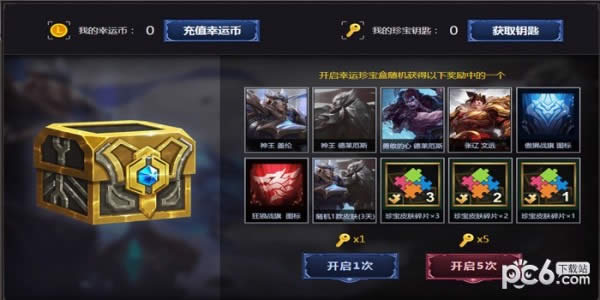 ※幸运珍宝盒物品获得概率:永久皮肤 1.35%、永久英雄0.35%、 3天体验皮肤 15%、3天体验英雄 5%、皮肤碎片 78.3%;