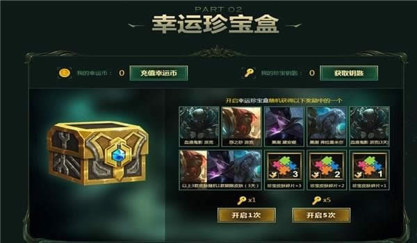 为各位带来lol幸运珍宝盒活动地址2018,参与到这次lol幸运珍宝盒皮肤抽奖地址2018的玩家们将可以获得各种皮肤和特殊皮肤碎片奖励,下面我们就来看一看lol幸运珍宝盒活动地址2018吧。