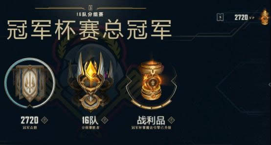 冠军杯赛中,当你完成一个比赛日的比赛后,你会获得冠军点数和其他战利品的奖励,冠军点数的作用是可以解锁召唤师旗帜以及战队图标等游戏奖励。而最华丽的奖品莫过于奖杯,给予那些赢下分组冠军的战队,获得旗帜和奖杯后,它们会出现在你的召唤师峡谷(地图)之中,除此之外,16队分组总冠军的战队ID和奖杯会展示在胜者的界面中。