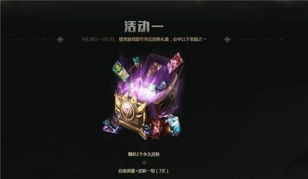 【1】4月28日—5月1日,登录游戏即可开启皮肤礼盒,必中以下奖励之一随机1个永久皮肤或自选英雄+皮肤一组(7天)