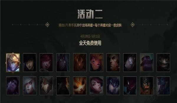 【2】精选LPL春季赛20个出场英雄+每个英雄对应一款皮肤4月28日-5月1日全天免费使用