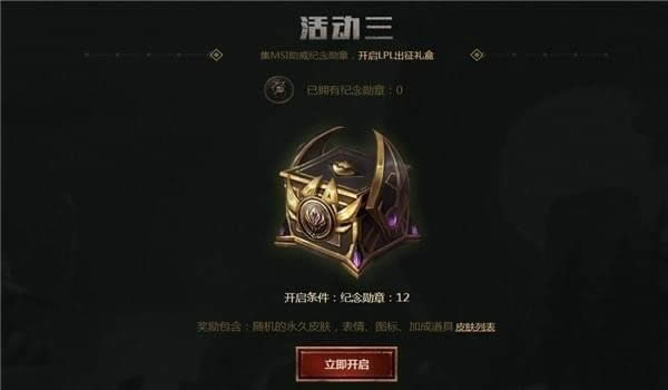 【3】集MSI助威纪念勋章,开启LPL出征礼盒奖励包含:随机的永久皮肤,表情、图标、加成道具