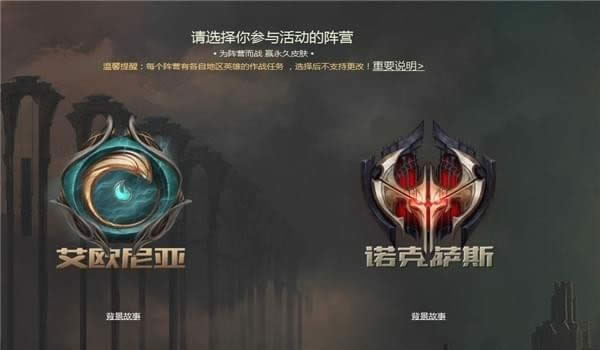 1为阵营而战 赢永久皮肤 •温馨提醒:每个阵营有各自地区英雄的作战任务 ,选择后不支持更改!