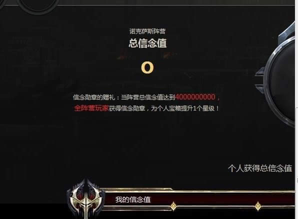 2信念勋章的赠礼:当阵营总信念值达到4000000000,全阵营玩家获得信念勋章,为个人宝箱提升1个星级!