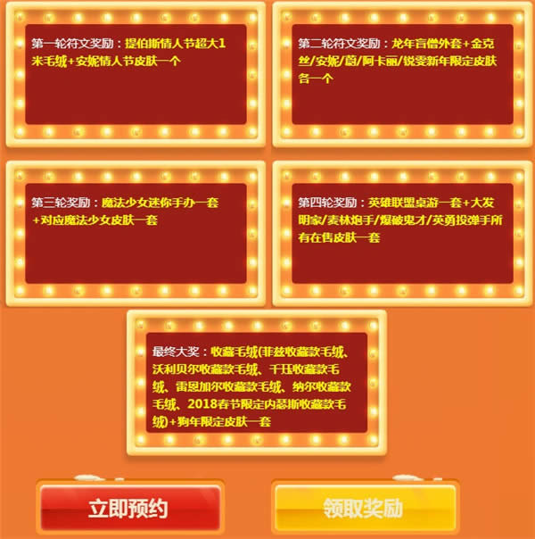 所有玩家在预约观看时均将获得5枚符文,届时拜年秀播放期间将揭晓5轮符文奖励,你的符文与其完全排列一致,即可获得上列奖励。