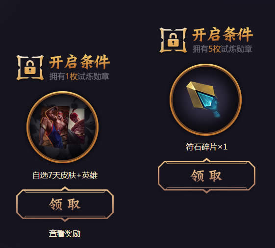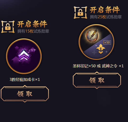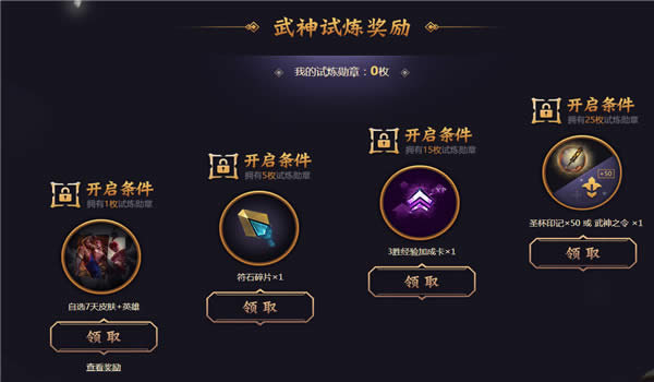 拥有1枚试炼勋章即可获得自选7天皮肤+英雄、拥有5枚试炼勋章即可获得符石碎片X1、拥有15枚试炼勋章即可获得3胜经验加成卡 X1、拥有25枚试炼勋章 可随机获得圣杯印记 X50 或 武神之令 X1。