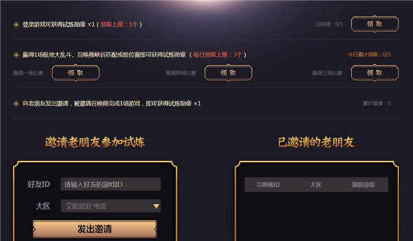 3.今日累计领取:0/3赢得一场比赛 赢得两场比赛 赢得三场比赛 向老朋友发出邀请,被邀请召唤师完成1场游戏,即可获得试炼勋章 ×1