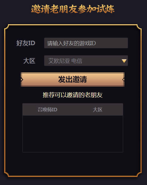 邀请老朋友(老朋友定义:2017年7月18日后有登录过游戏,且在12月15日后未登录过游戏的召唤师)参与活动,老朋友登录游戏完成任意游戏对局, 可以领取1枚试炼勋章。(同一个召唤师收到多个邀请时,仅第一次邀请有效。)