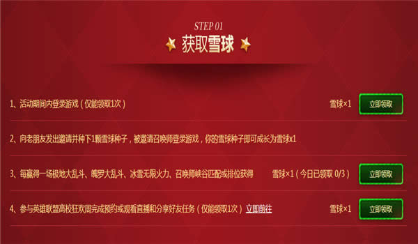 2.每赢得1场极地大乱斗、魄罗大乱斗、冰雪无限火力、召唤师峡谷匹配或排位可以获得1颗雪球(每天获得上限3颗,且仅限绑定大区当天领取)。