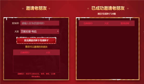 3.邀请老朋友(老朋友定义:2017年6月21日后有登录过游戏,且在11月18日后未登录过游戏的召唤师)参与活动,好友成功登陆游戏后,可以领取1颗雪球。(同一个召唤师收到多个邀请时,仅第一次邀请有效。)