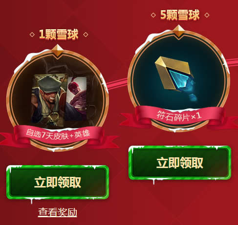 6.拥有1颗雪球即可获得自选7天皮肤+英雄、拥有5颗雪球即可获得符石碎片X1、拥有12颗雪球即可获得4胜经验加成卡