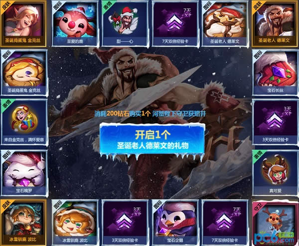 购买1个河蟹陛下守卫,赠送1个圣诞老人德莱文的礼物,同时开启,随机开启以下道具中的1个,每个道具最多可以获得1次,直至抽取完所有道具。