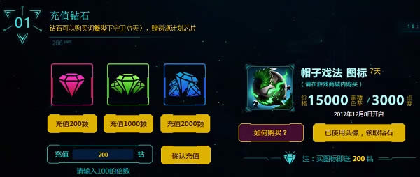 1.使用Q币充值钻石,10Q币充值100钻石。在游戏客户端购买并使用期限图标“帽子戏法图标”,赠送200钻石,图标限购买一次。充值的钻石会在页面上显示
