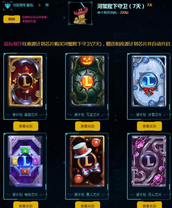 2.使用钻石兑换珍稀守卫皮肤,其中200钻石兑换1个“河蟹陛下守卫(7天)”,赠送1个任意源计划芯片并自动打开获得奖励。查看源计划芯片的奖励