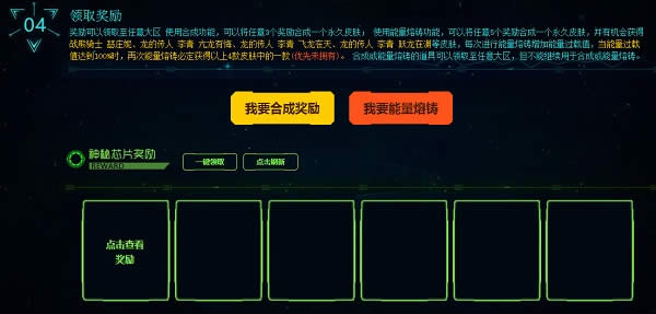 奖励可以领取至任意大区 使用合成功能,可以将任意3个奖励合成一个永久皮肤 使用能量熔铸功能,可以将任意5个奖励合成一个永久皮肤,并有机会获得战熊骑士 瑟庄妮、龙的传人 李青 亢龙有悔、龙的传人 李青 飞龙在天、龙的传人 李青 跃龙在渊等皮肤,每次进行能量熔铸增加能量过载值,当能量过载值达到100%时,再次能量熔铸必定获得以上4款皮肤中的一款。 合成或能量熔铸的道具可以领取至任意大区,但不能继续用于合成或能量熔铸